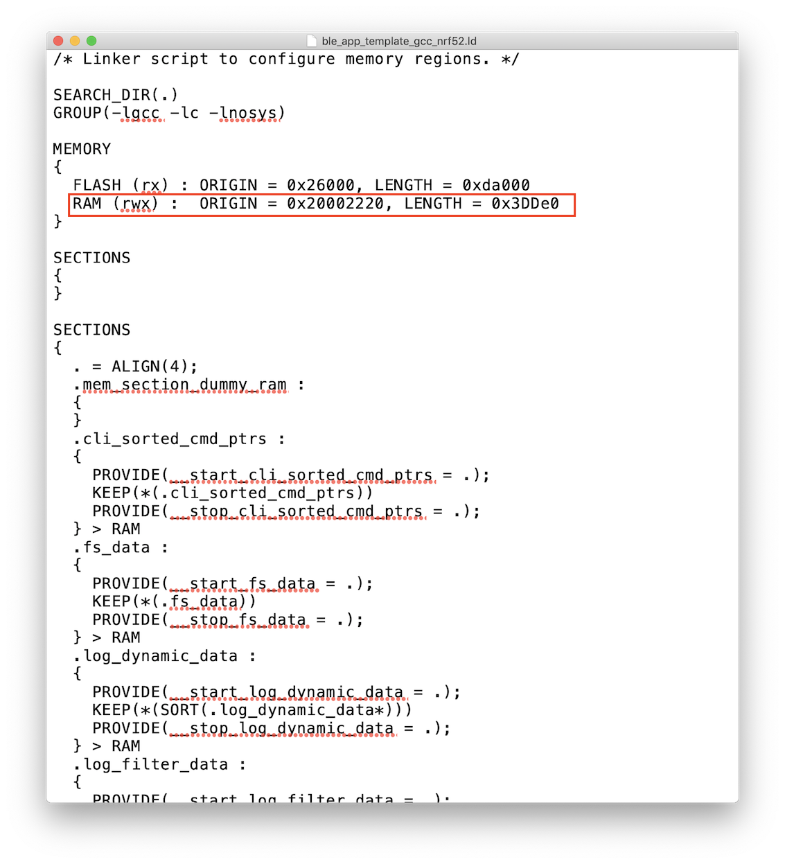 In order to apply the fix, we need to edit the file named ble_app_template_gcc_nrf52.ld located at ble_app_template/pca10056/s140/armgcc/ and modify the values of