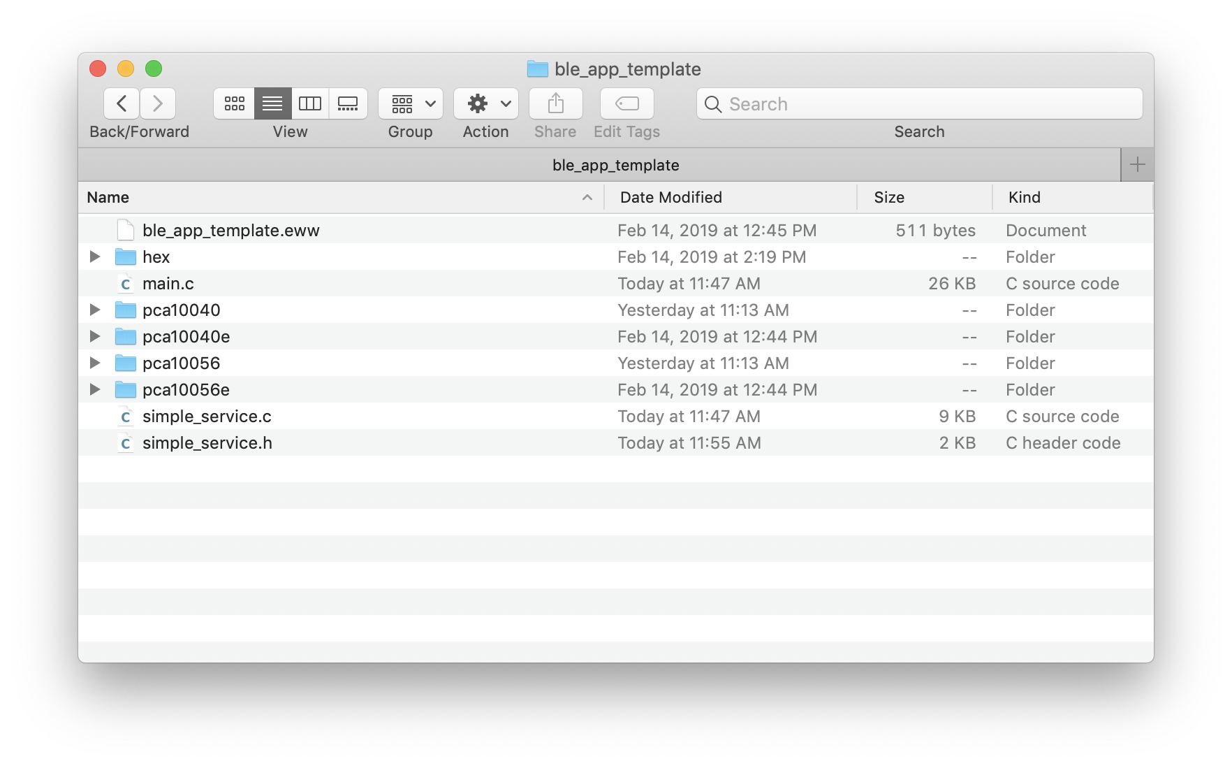Makefile. We add$(PROJ_DIR)/simple_service.cto theMakefilefile which is located atble_peripheral/ble_app_template/pca10056/s140/armgcc/Makefile:$(PROJ_DIR)/main.c \ $(PROJ_DIR)/simple_service.c \ $(SDK_ROOT)/external/segger_rtt/SEGGER_RTT.c \ -