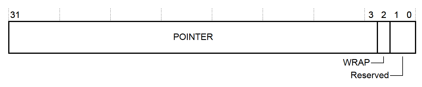 MTB_BASE+POINTER. - Whether the data in the buffer has rolled around. If the storage has been filled and wrapped around, the “wrap” bit will be set. We can use this information to determine where the oldest trace packet is. If the “wrap” bit is set, the oldest record is at the “pointer” offset, otherwise it is at offset 0.