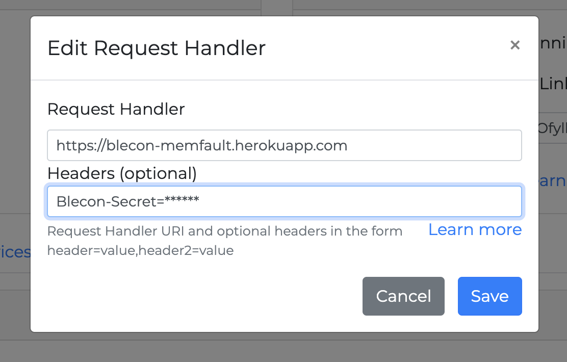 We deploy it to Heroku, and configure the Blecon network request handler’s URL and secret within the Blecon console.