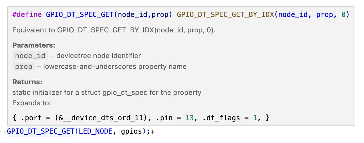 So far, we’ve only used the macros from the Devicetree API zephyr/include/zephyr/devicetree.h. Now we see how Zephyr’s drivers create their own Devicetree macros on top of this basic API. We can find the macro declaration in Zephyr’s gpio.h header file.